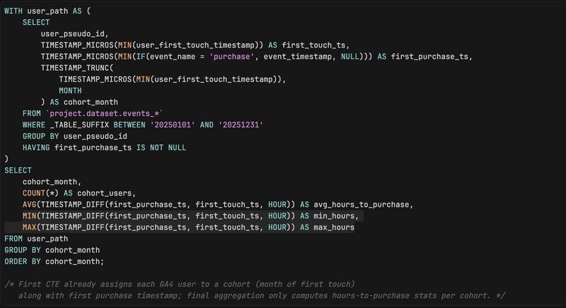 Once you have this per-user metric, you can summarize it by channel, campaign, or cohort and see how quickly different segments convert. That is far more actionable than a generic “average time to purchase” taken from a UI.