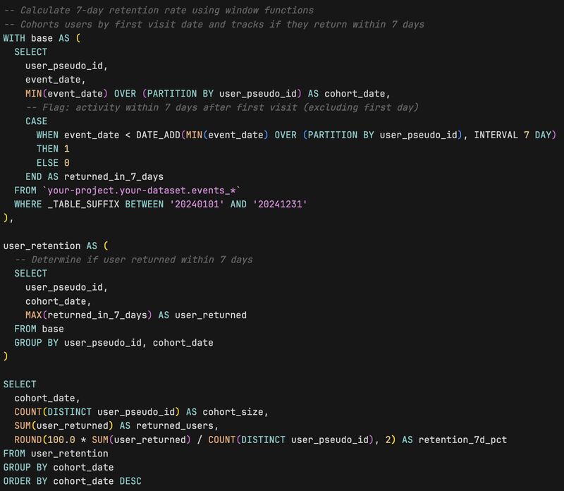 SQL lets you anchor users by their first activity date and then track if they return in following days or weeks. Window functions make it easy to:
