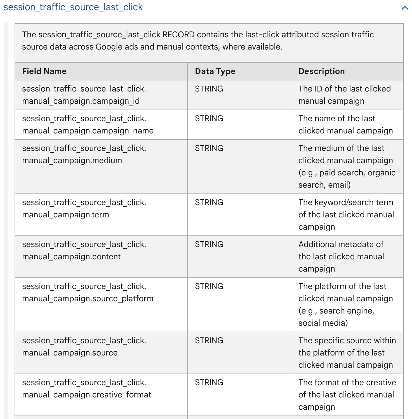 session_traffic_source_last_click – provides last-click attributed session data across Google Ads and manual contexts (like email campaigns or social media promotions). Now, there’s no need to parse the collected_traffic_source field—everything is ready to use for attribution calculations!