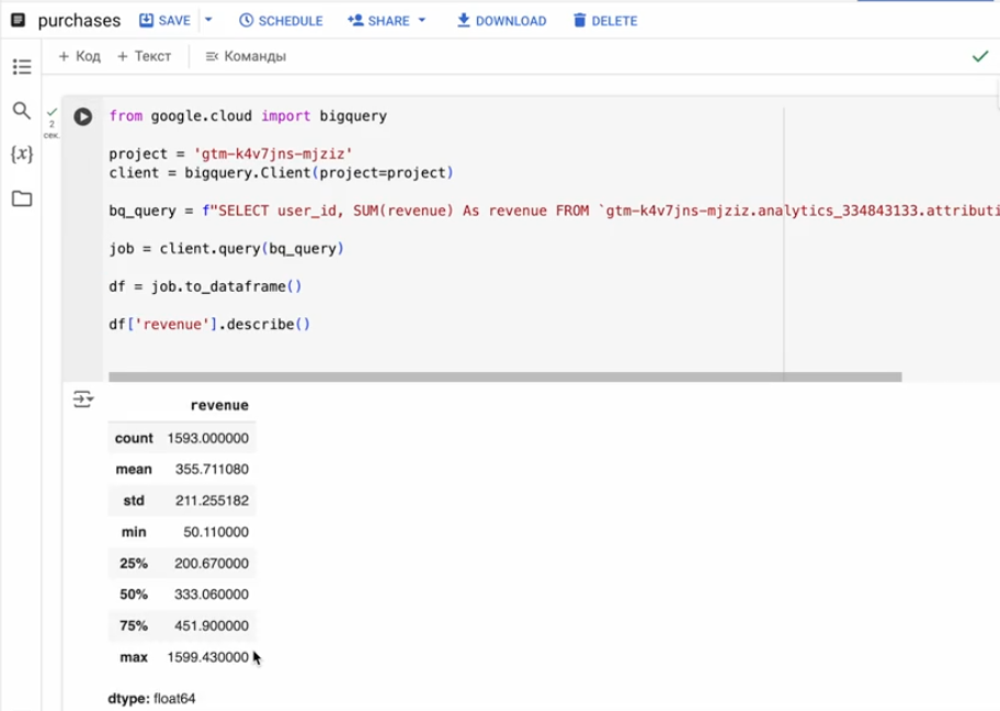 The notebook code is very simple, as you can see. To make this process even easier, save the notebook in advance in BigQuery’s Notebooks tab. This allows you to quickly access it for any updated data analysis with a single click.